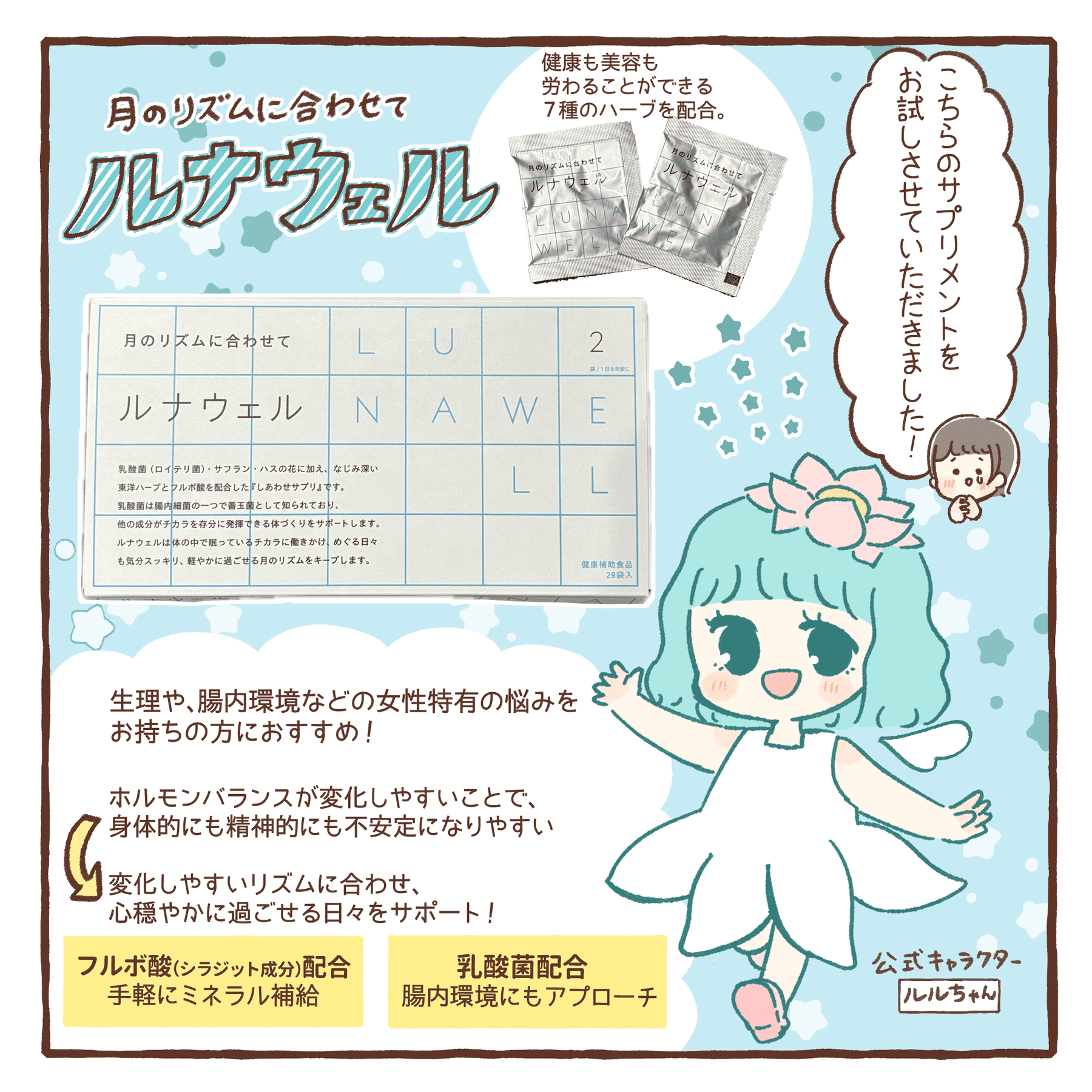 悩める女性の味方「サフラン」、澄んだ気持ちと美を保つ「ハスの花」などの6種の東洋ハーブ、内から健康を支える「乳酸菌」(ロイテリ菌)、ミネラル分のサポーター「フルボ酸」(精製シラジット成分)を配合